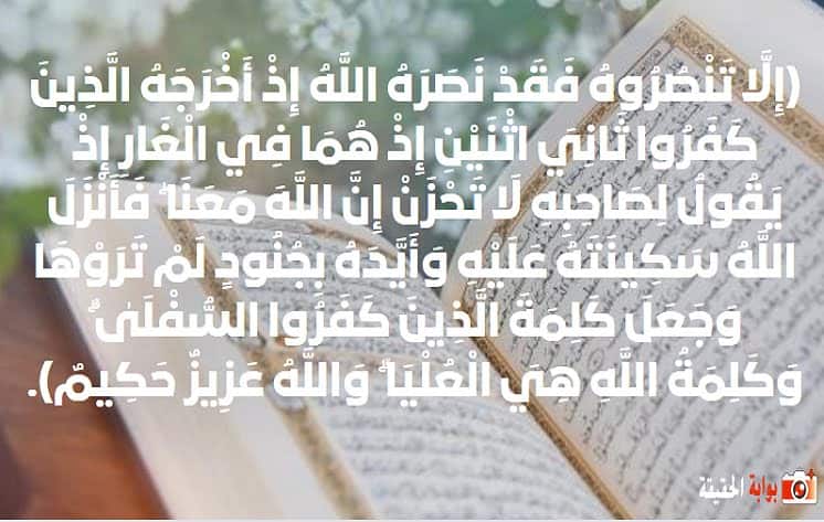 - جاءت آية من تلك الآيات في سورة التوبة والتي شرح الله -عز وجل- فيها حال سيدنا مُحمد (صل الله عليه وسلم) عندما كان في غار حراء مع سيدنا أبو بكر (رضي الله عنه) لطمأنته من أي خوف أو فزع، وذلك بقوله تعالى: